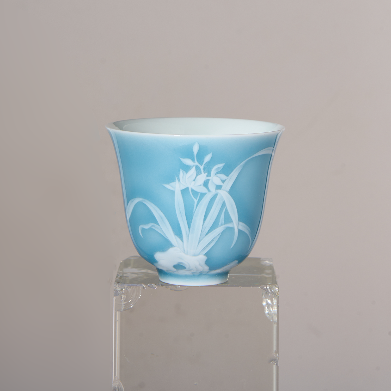 Emperor Huizong of the Song Dynasty’s famous line “After the rain, the sky clears and the clouds break, this color shall be created for future generations” is one of the most beautiful poetic descriptions of ceramic glaze throughout history. This bell-shaped cup is glazed with the sky-blue glaze beloved by Emperor Huizong, complemented by the white stacking technique used in the Ming and Qing imperial courts, bringing the design to life in vivid relief.